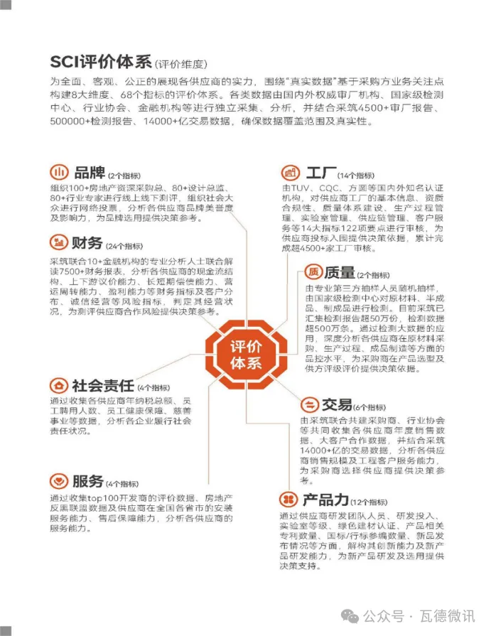 采筑聯(lián)合100+開發(fā)商、80+設(shè)計(jì)機(jī)構(gòu)、15+金融機(jī)構(gòu)、11家國(guó)內(nèi)外權(quán)威認(rèn)證機(jī)構(gòu)、30家國(guó)家級(jí)檢測(cè)中心、11家行業(yè)協(xié)會(huì)等成立SCI共建聯(lián)盟,以專業(yè)的視角、嚴(yán)謹(jǐn)?shù)脑u(píng)審體系、龐大的數(shù)據(jù)基礎(chǔ),圍繞“真實(shí).數(shù)據(jù)”,基于采購(gòu)方業(yè)務(wù)關(guān)注點(diǎn),提取工廠、質(zhì)量、交易、產(chǎn)品力、服務(wù)、社會(huì)責(zé)任、財(cái)務(wù)、品牌共8大維度68個(gè)細(xì)分指標(biāo)對(duì)供應(yīng)商進(jìn)行全面評(píng)價(jià),使用一手?jǐn)?shù)據(jù)客觀公正輸出“SCI”,為行業(yè)及用戶提供更加真實(shí)、專業(yè)的數(shù)據(jù)服務(wù),賦能產(chǎn)業(yè)鏈高質(zhì)量發(fā)展。
